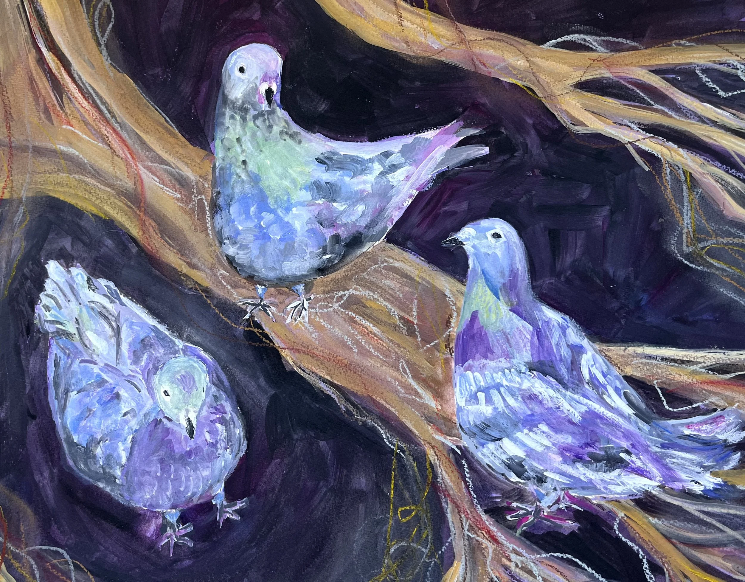 Spending so much time in local parks, I watch the tourists, birds, and shifting lights. In the poem (and in many paintings), I’ve added a new obsession- pigeons. Here’s a mixed media piece inspired by the poem about my visits to Tetuan Plaza’s banyan trees. Here, pigeons are standing among the bare roots of the Banyan trees. Enjoy!