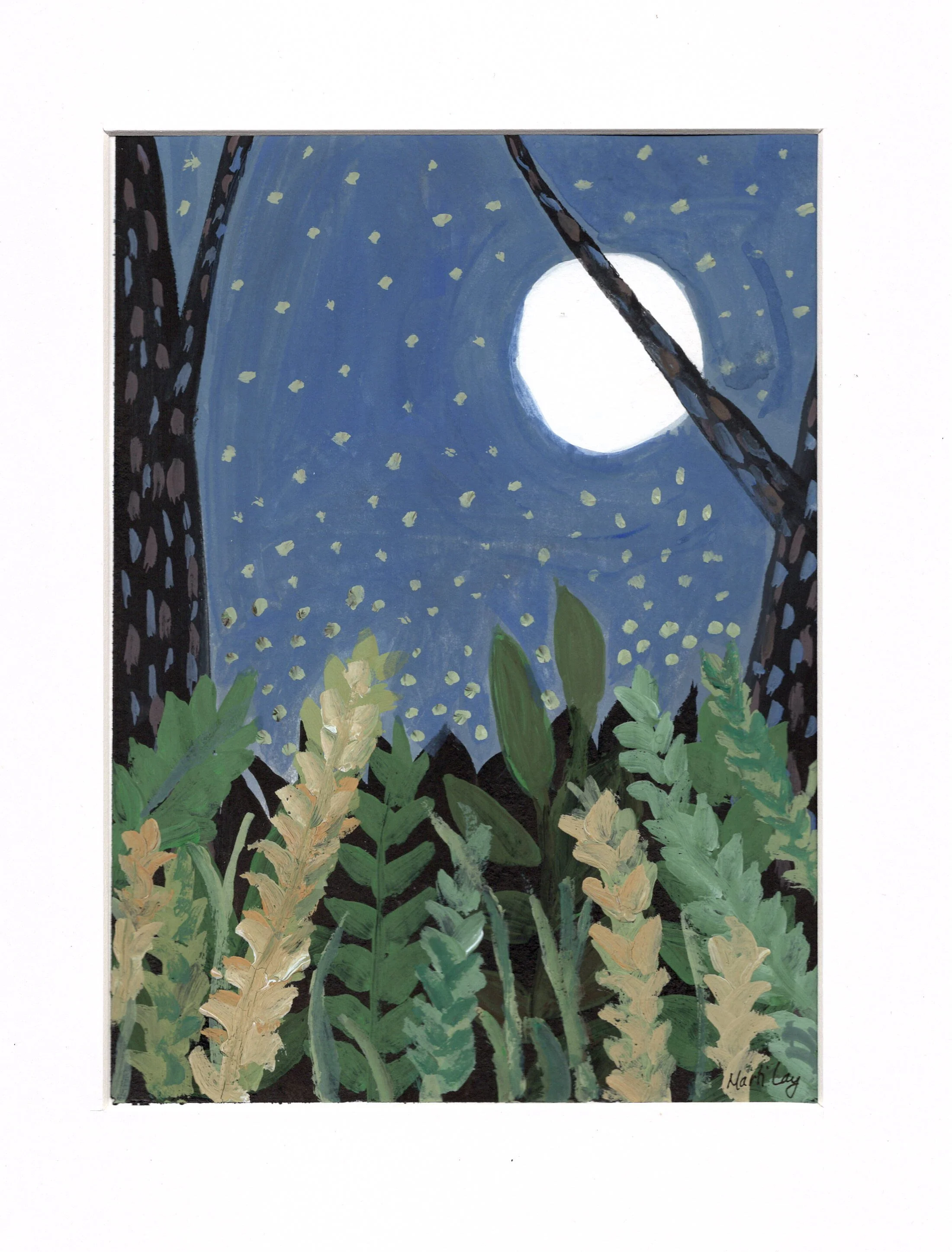 A peaceful night among the ferns and trees in the forest, lit only by the moon. Perfect to mix and match with other petite paintings of mine on someone’s bedroom or nursery wall.